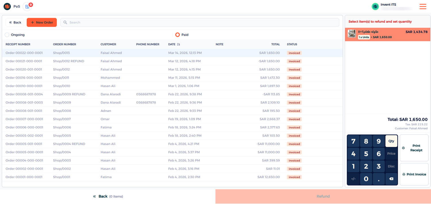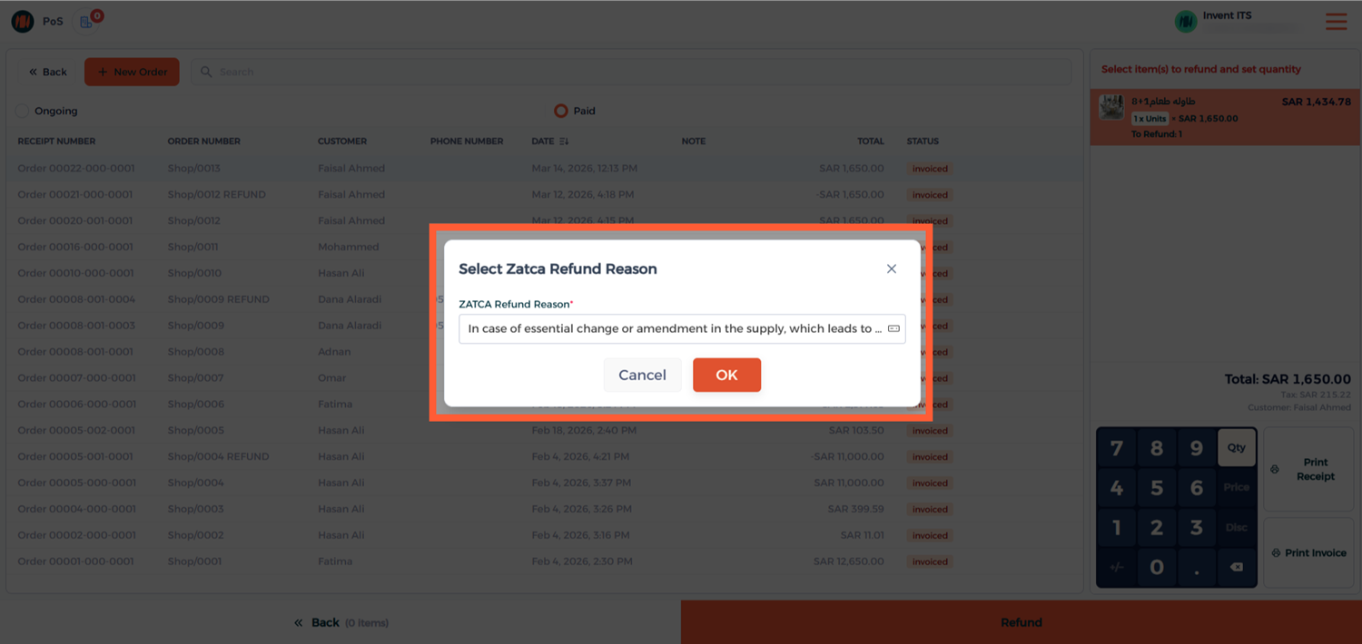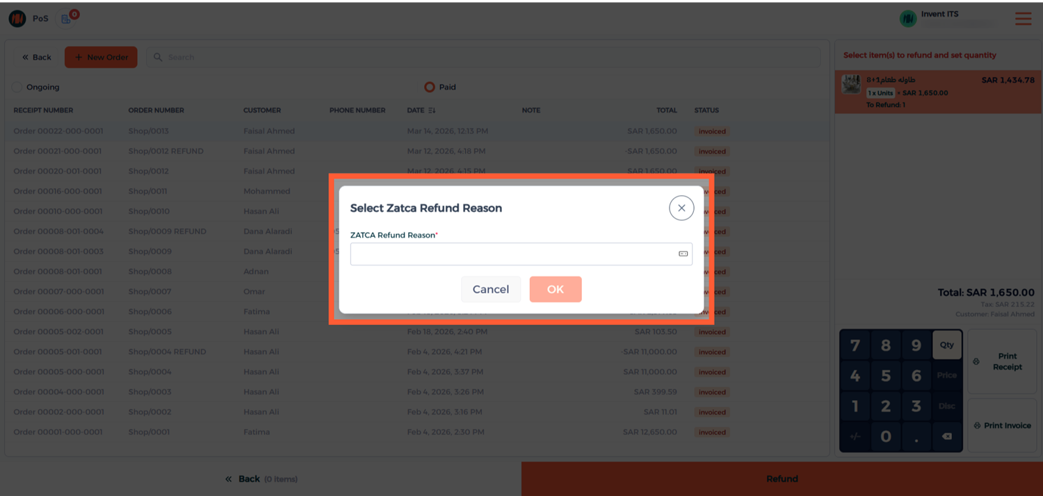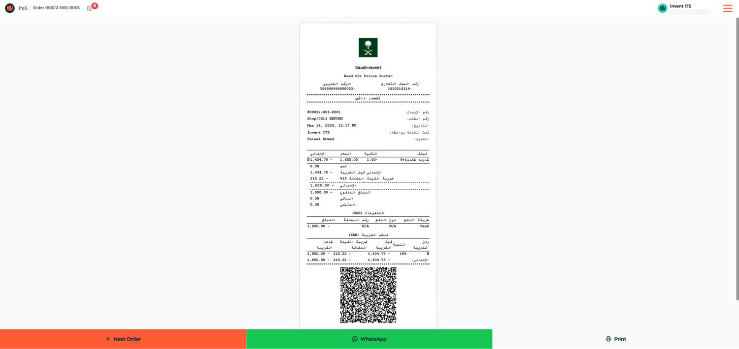• All POS invoices and refunds are automatically submitted to ZATCA through Invent ERP.