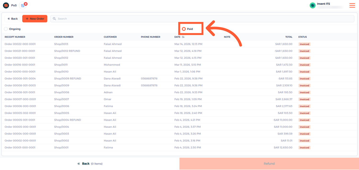 From the Point of Sale interface, navigate to Orders and the open Paid Orders.