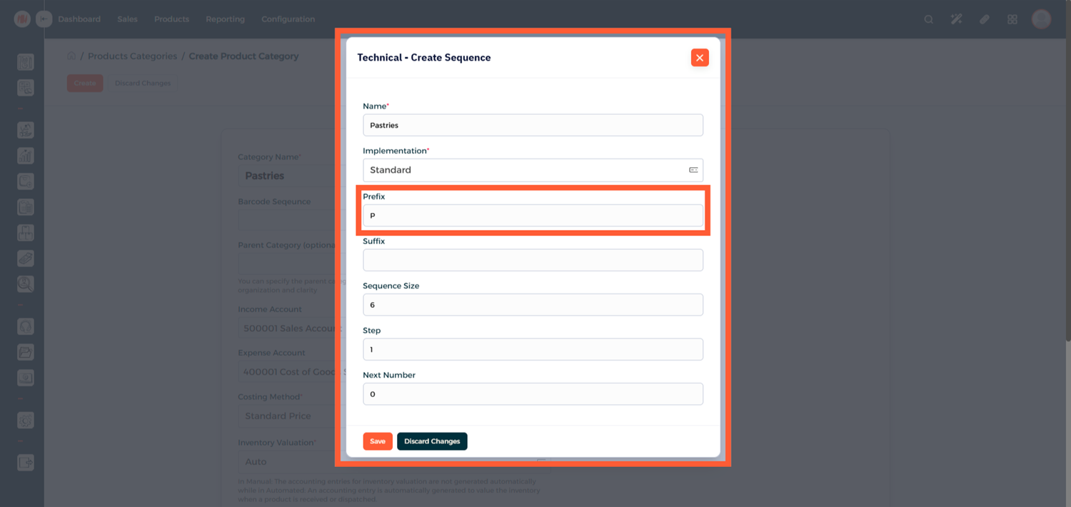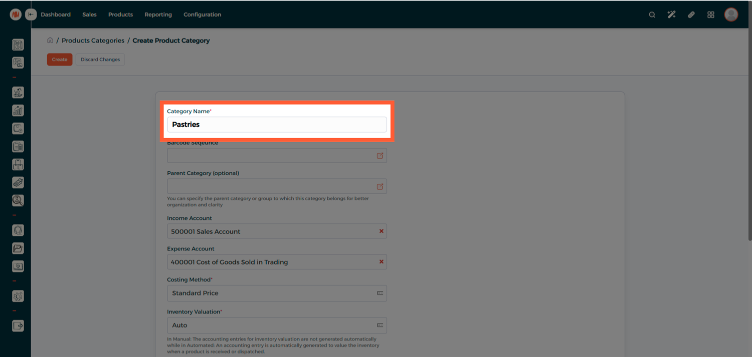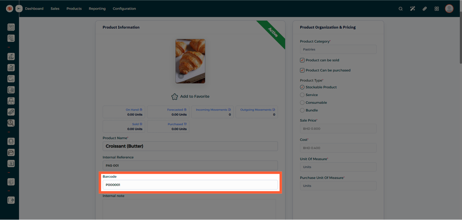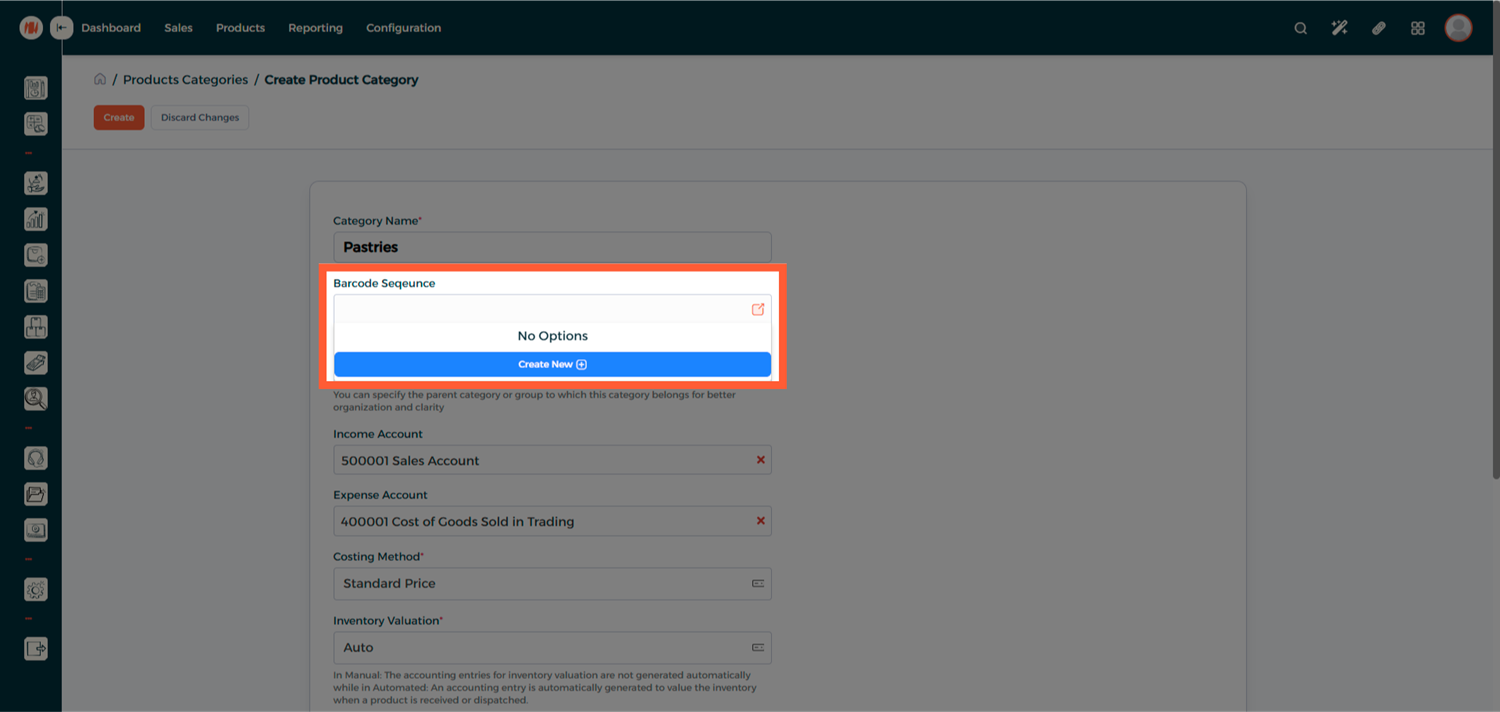 • Always create and configure the barcode sequence at the category level before adding products to ensure consistent barcode generation.