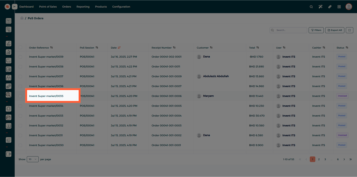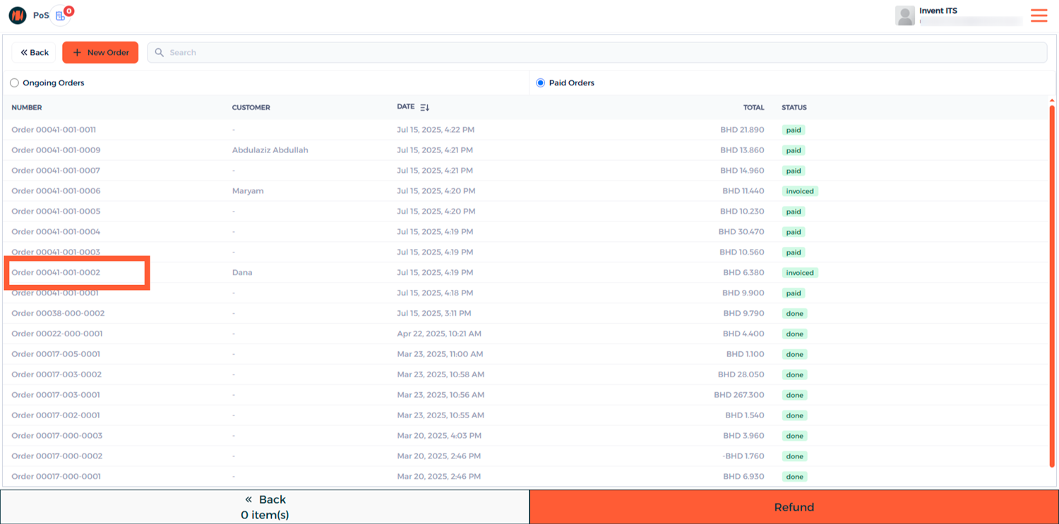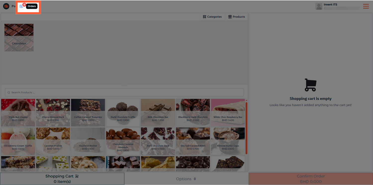 From the Point of Sale session, head to the Orders to view all completed transactions.