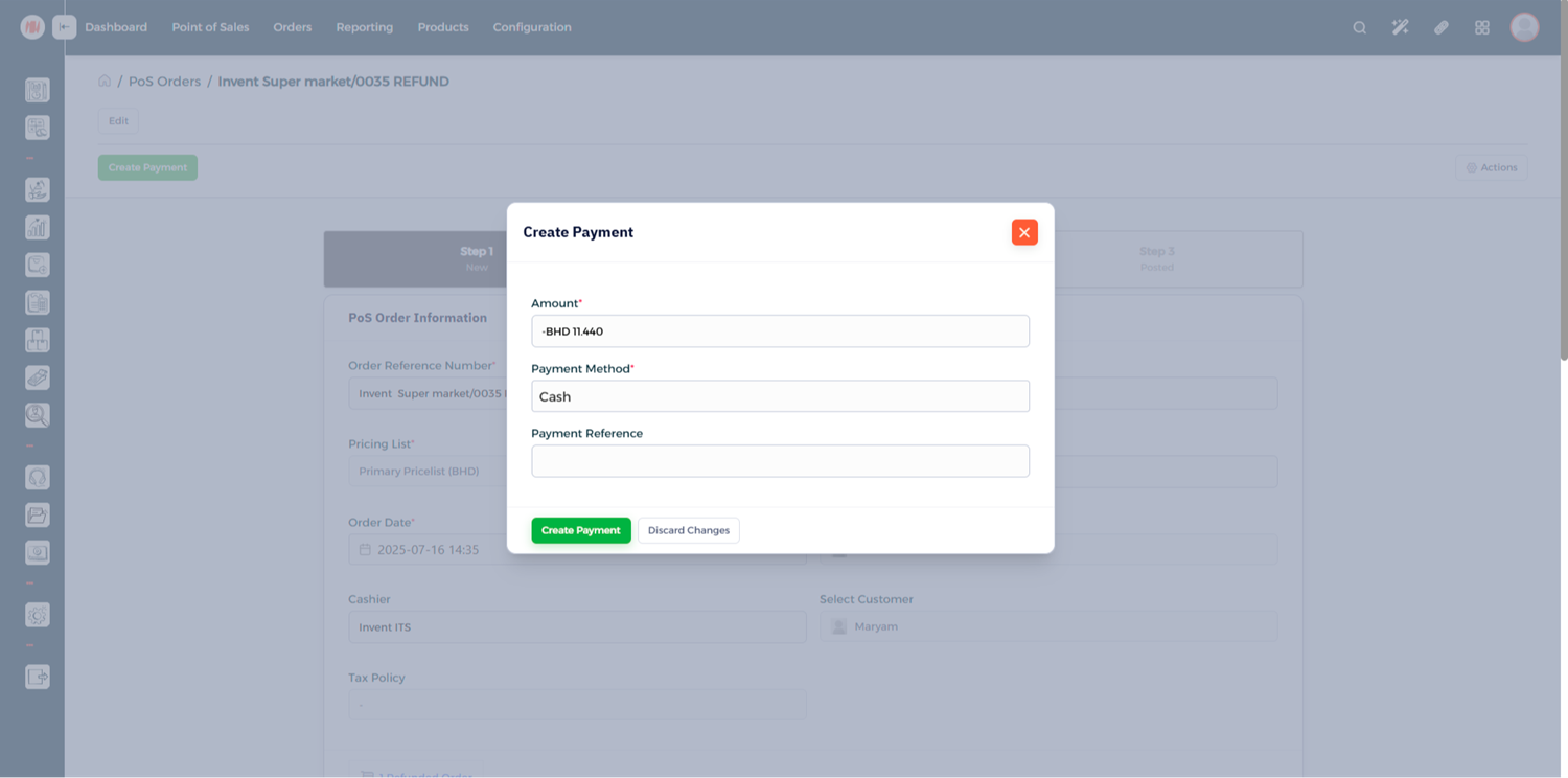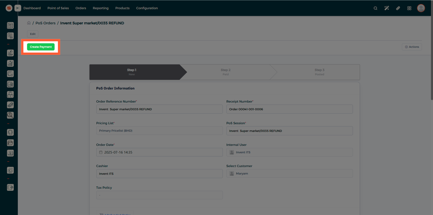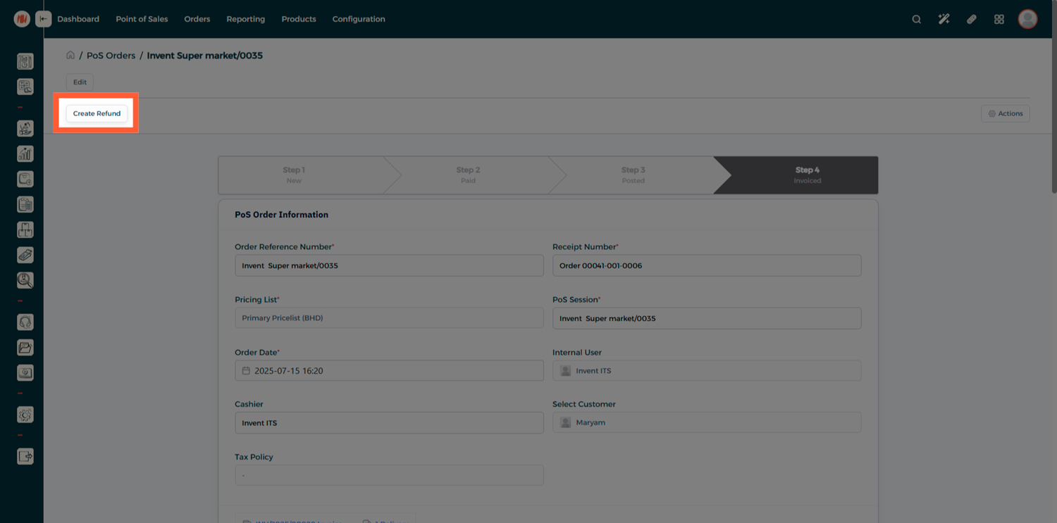 Click on Create Refund - the system will generate a new refund order linked to the original sale.