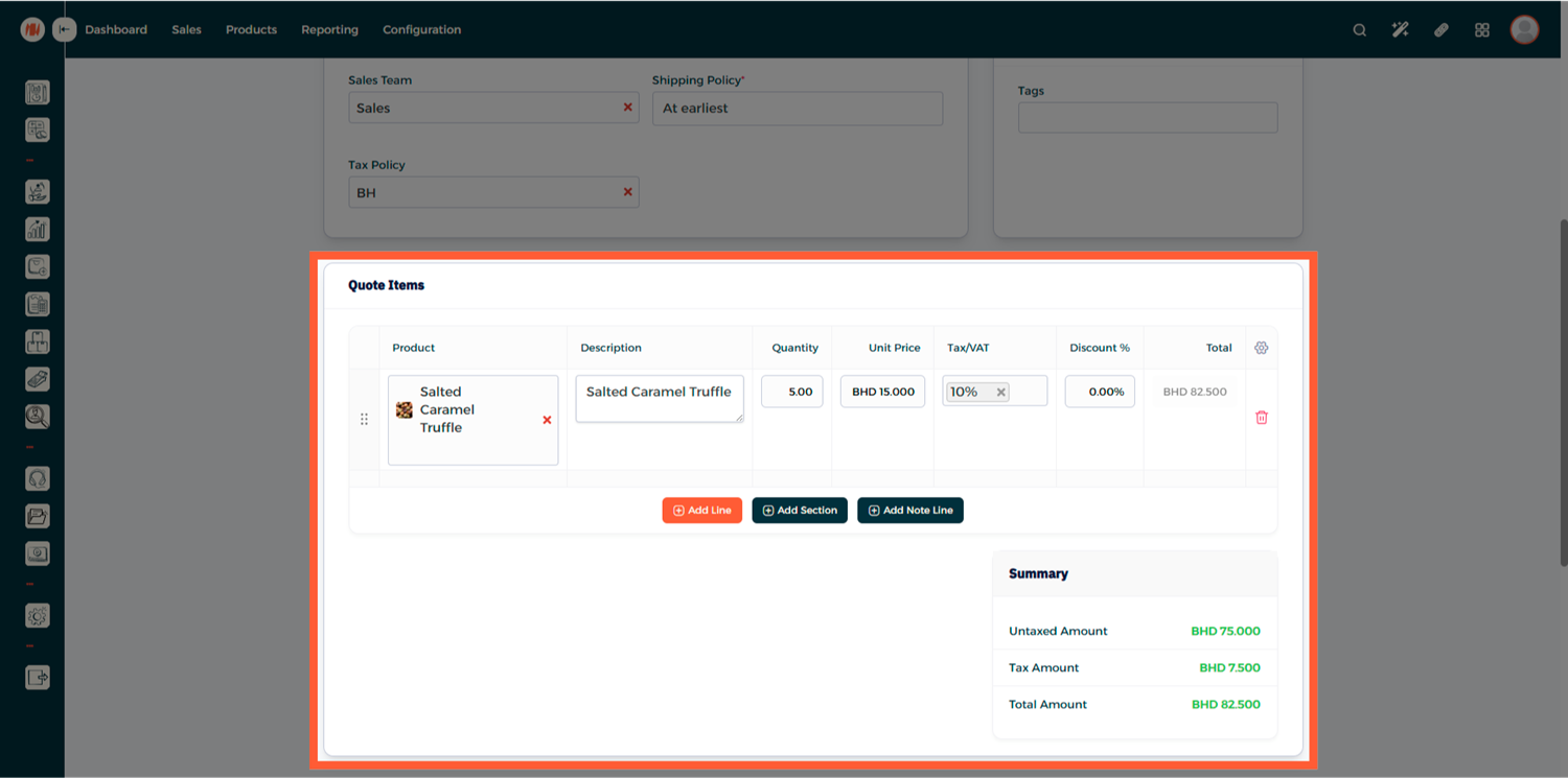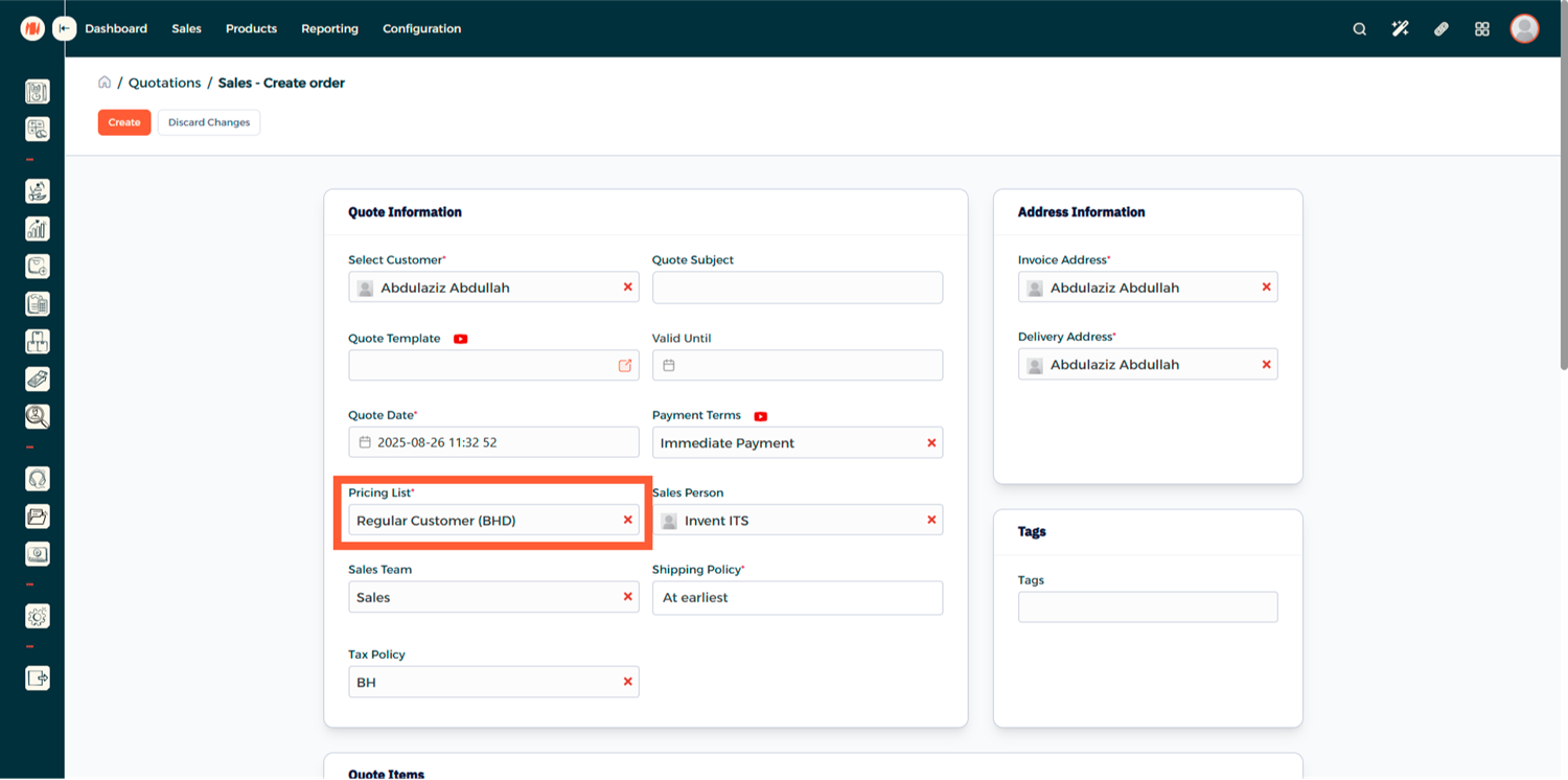 Add products to the quotation. The pricing from the selected price list will automatically apply when the quantity matches the defined rule.