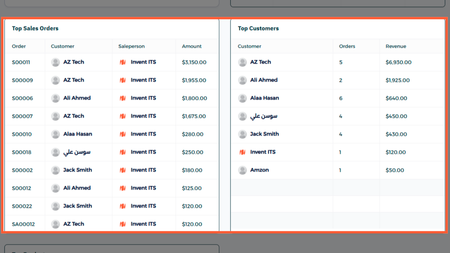 - Quick access — view top customers and products right from the dashboard
